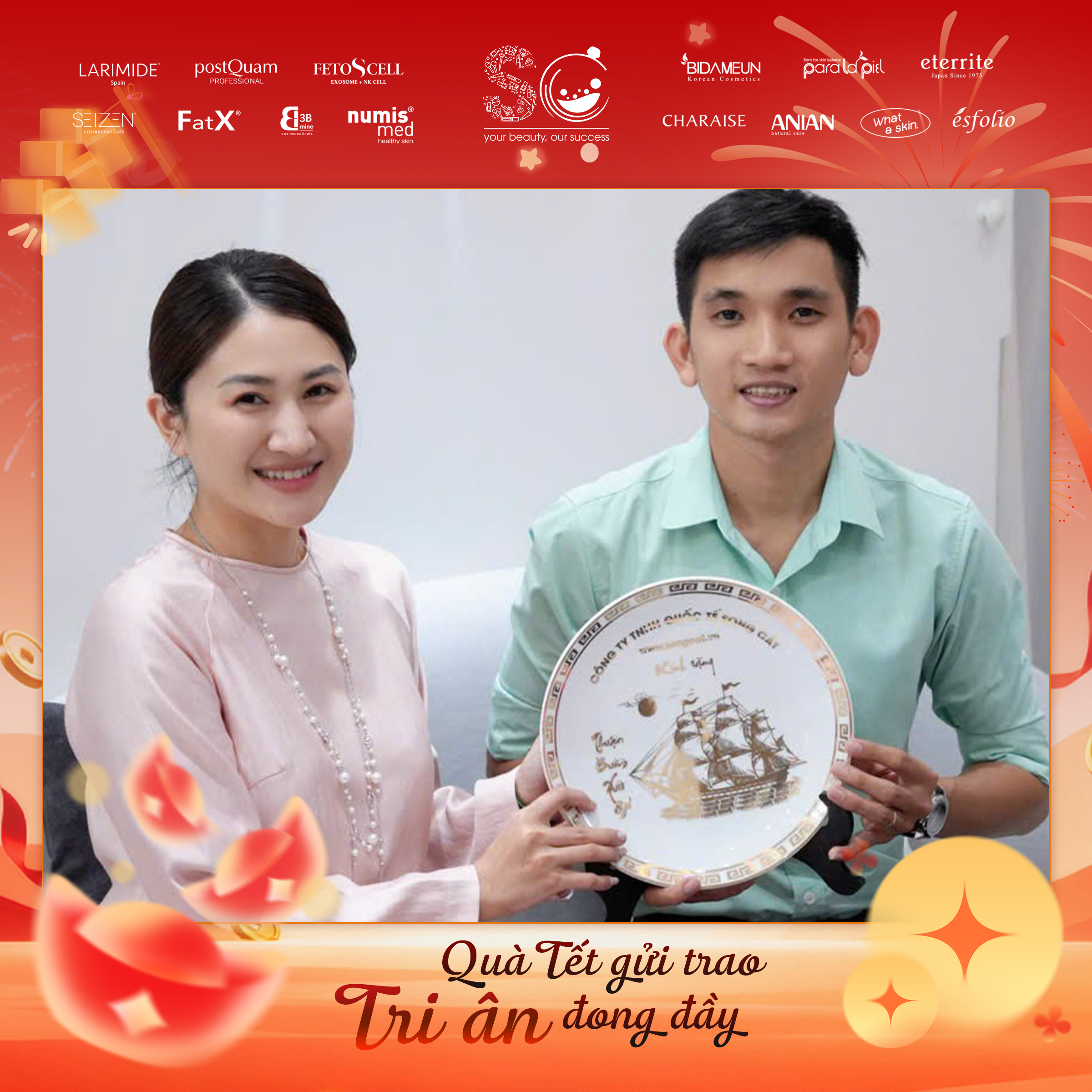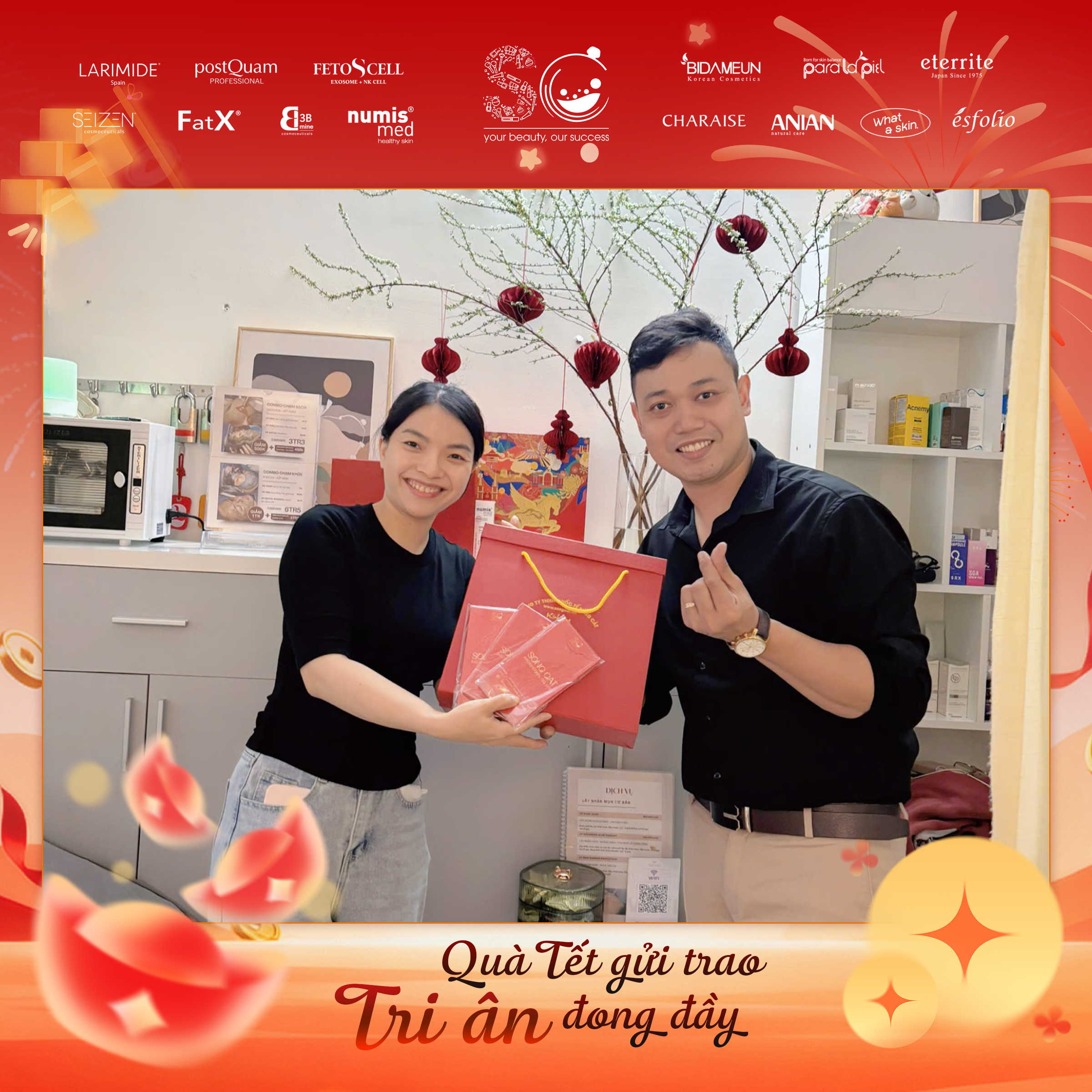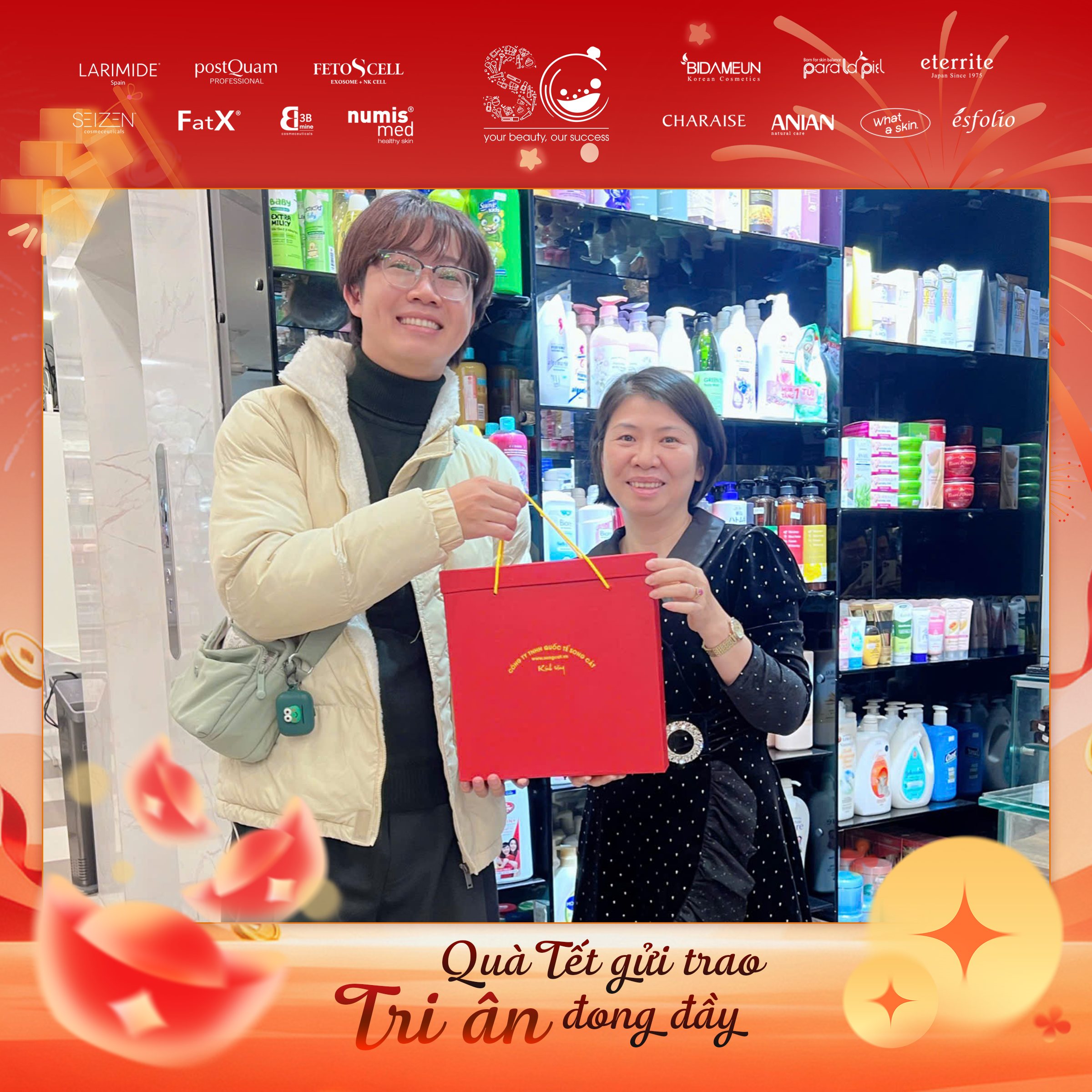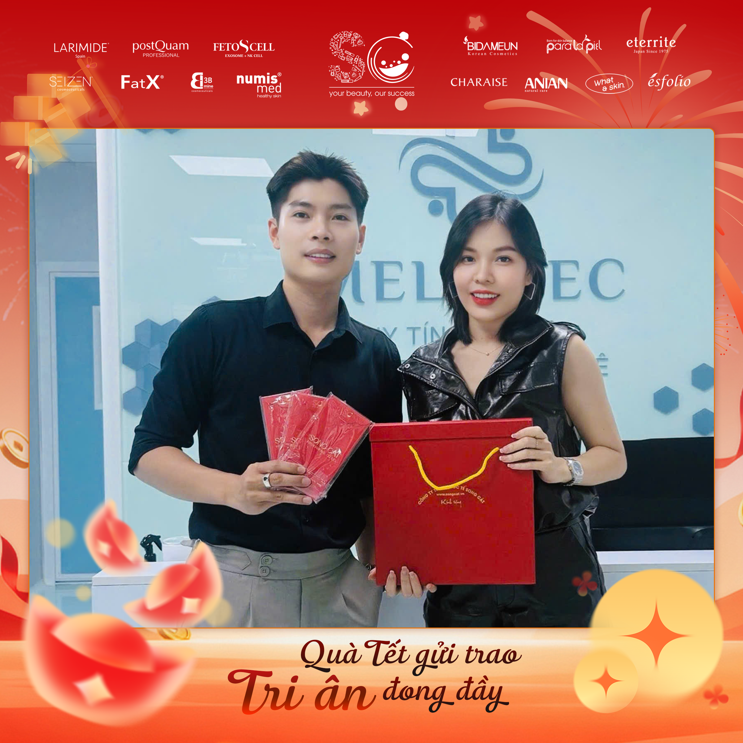 Có thể là hình ảnh về văn bản cho biết 'LARIMIDE postOuam จะชวงนน FETOSCELL SEIZEN FatX រ numis med *EIDAMEUN たこ paralapa eterrite CHARAISE ណល ANIAN 번로 ésfolio DUY HUNG dermaclinic Quà Tết gửi trao Tri ân đong đầy'